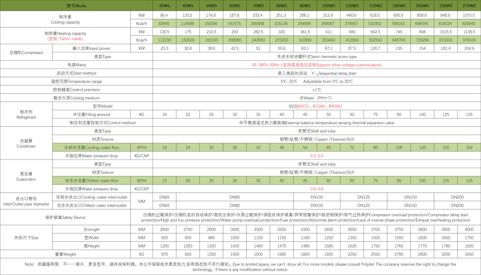 产品介绍可以后台更新,现在是演示的资料,WS 系列机组为各种机械设备或未端装置提供冷冻水或热水,机组设计成室外(屋顶或地面)安装,每台机组包括采用**率、低噪音的螺杆式压缩机、使用壳管式冷凝器,干式(满液式或降膜式)蒸发器以及微电脑控制中心等主要部件,水冷式机组因散热系统(冷却塔)独立,因此主机体积小,占地少,主要用于大冷量机组。机组采用一体式控制柜对电箱内部电气元件起到了很好的保护,机组使用中文微电脑或 PLC控制系统,能自动地根据负荷大小进行能量控制,达到较佳匹配,真正实现较佳的节能运行。本品也可做为模块化机组,用户可根据需求自主组合。可广泛应用于新建和改建的大小工业与民用建筑空调,尤其对于环境温度比较高的地区(如南方区)优势明显。机组整体设计寿命 20 年。双螺杆压缩机技术
